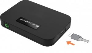 Connect the USB charging cable (included) to the charging brick (included) and then plug the USB-C end into the hotspot. Finally, plug the charging brick into an electrical socket. The battery indicator flashes while charging. It will take around three to four (3 – 4) hours to fully charge. The hotspot may be used while it is charging.